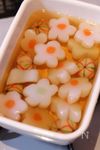 鍋にA だし汁 200ml、うすくち醤油 大さじ1、みりん 大さじ2、酒 大さじ2、塩 小さじ1/2 を入れて中火にかけ、花こんにゃく・手毬麩を入れる。煮立ったら弱火にして、そのまま20分煮込む。 |