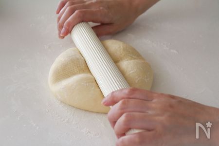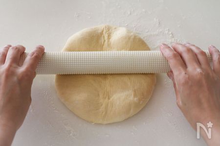 中央から順に縦横に麺棒を置いて少しずつ伸ばします。この時4つの角に生地の“たまり”を残しながら少しずつ伸ばすのがポイント。