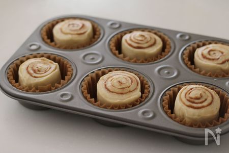 カットした生地の切り口を上にして型に入れ、15~20分を目安に二次発酵させます。型に入れなくても作れますが、型に入れたほうがきれいに焼きあがります。今回は、グラシンケースをしいたマフィン型を使用しました。(グラシンケースを使用せず、マフィン型にバターを塗って生地を入れてもOKです。)