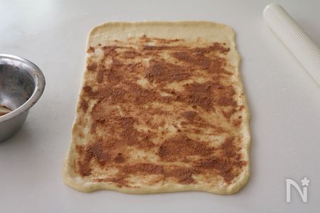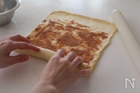 フィリングを上手にしっかり巻くコツは、生地をきれいに四角く伸ばすこと。これさえ押さえれば、シナモン以外にもいろいろなフィリングを巻いてアレンジできますよ。