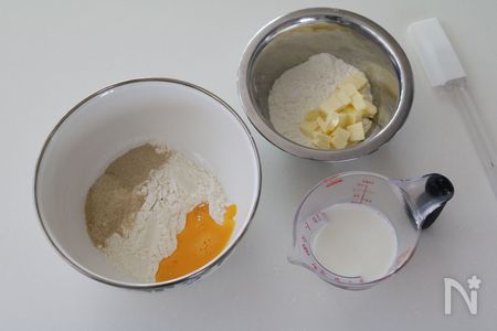 ・大きいボウル(ボウルA)に混ぜ合わせた粉の半量と砂糖、卵、ドライイーストを入れます。卵はイーストから離してボウルに入れてください。