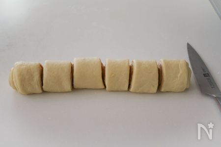 生地を手前からくるくると巻いていきます。この後生地が膨らむので、あまりきつく巻きすぎないように、力を入れずにくるっと巻いてください。生地を巻いたらとじ目をしっかり閉じます。