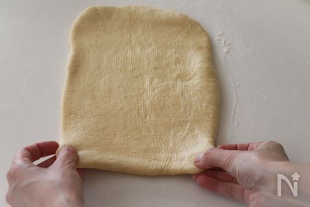 ある程度大きくなったら角を引っ張って伸ばしましょう。こうすると丸い形からきれいに四角く伸ばすことができます。