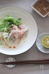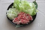 レタスは食べやすい大きさに切る。長ネギは斜め薄切りにする。 野菜と豚肉をお皿に盛り付ける。 |