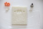 アスパラは塩茹でして小口切りにします。スライスチーズとハムはお好みの型で型抜きます。「NEWクレラップ」を20㎝×20㎝の大きさに切って広げ、上に型で抜いた具をのせ、表面にバターを少し塗ります。 | |