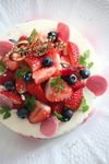 レアチーズケーキを型から外して、上に飾り用のイチゴ・ブルーベリー・セルフィーユ、5のチョコで飾る。 | |
