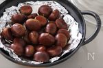 STAUB鍋にアルミホイルを敷き(焦げ付き予防)、栗を広げて入れる(栗についた水分もそのままで)。蓋をして中火にかけ、2~3分してお鍋が温まったら弱火にする。 | |