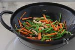 フライパンに残りのサラダ油を加え、ピーマン、にんじん、椎茸、生姜を加えて炒める。 | |