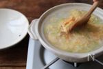 鍋にA だし汁 400㏄、塩 小さじ1/4、みりん 小さじ1、醤油 少々 を入れて火にかける沸騰してきたらごはんを入れてひと煮立ちさせ、長ネギと塩鮭を入れて1~2分弱火で煮る。味をみて必要なら塩で整える。(*ごはんを入れた後の煮る時間が短いほどさらっとした仕上がりに。) |