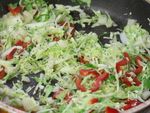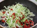 じゃがいもが透き通ってきたら、キャベツと甘とうがらしを入れます。 | |