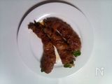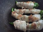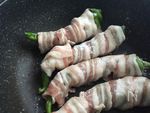 万願寺唐辛子に豚バラ肉を巻きつけ 軽く塩・コショウ 片栗粉をふる ★肉は焼くと縮むのでしっかり全体に巻き付ける |