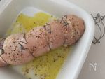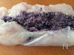 広げた鶏むね肉に ブルーベリーパン粉をのせくるくると巻く | |