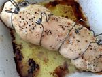 長さがきっちりぴったりはまる耐熱皿に入れ 塩 黒コショウ オリーブオイル 白ワインをふり200℃のオーブンで約20分焼く ★クリップで止めました |