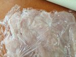 鶏むね肉は皮を取り 裏返して盛り上がっている部分2か所に切り込みを入れ全体を広げ ラップをかけ麺棒などでたたいて平らにする | |