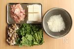 鶏もも肉はぶつ切りにする。ボールにAと一緒に入れ、揉み込む。 春菊は約5cm幅にカットし、茎の部分と葉の部分を分ける。 しめじは石づきを切り落とし、ほぐす。豆腐は水を切り、8等分にカットする。 大根は皮をむき、すりおろす。ザルにあけ、余分な水分を自然に切る。 |
