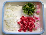 牛肉切り落としは食べやすい大きさに玉ねぎは粗みじんに 蒲鉾(ピンク)は1㎝角に切ります |