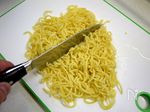 焼きそば麺は今回、ゆで麺を使用したので事前に水でほぐして適当な長さに切りました。(蒸し麺は油が絡んでることが多いのでフライパンの中でも切りやすいのでそのまま使います) | |