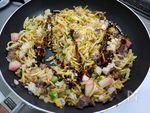 再び混ぜ合わせて炒めたら塩、胡椒、中濃ソースを加え弱火で混ぜ合わせて炒めたら刻み葱を加えて出来上がりです | |