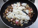 牛肉の色が変われば玉ねぎ、蒲鉾を加え玉ねぎに透明感が 出るまで炒めご飯を加えます |