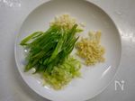 木綿豆腐は半分に切り水気を切っておきニンニク、生姜 長ネギの白い部分はみじんに切って青い部分は細切りにします |