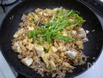 ヘラなどでざっくりと崩します (この時点でもう少し豆腐、大きめな状態がいいと 思いますよ) |