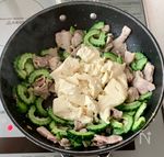 豚肉の色が変わり、ゴーヤがしんなりしてきたら、1の豆腐を加え、潰しながら炒め混ぜる。 | |