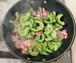 ゴーヤはよく洗い、縦半分に切り、スプーンなどで種とわたをきれいに取り除き、2mm厚さの半月切りにする。豚薄切り肉は一口大に切る。 | |