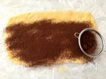 向こう端1cm位に溶き卵をハケで塗り、残り全面に純ココアを粉ふるいで振り広げる。 | |
