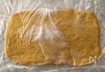 ひとまとまりになったら、ラップに挟み、15×25cm位に伸ばす。(※生地がラップにくっつきそうな場合は、強力粉を少しつけて下さい。※柔らかくなり過ぎたら、冷蔵庫で休ませて下さい。) | |