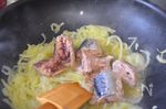 鯖缶を缶汁ごと加え、軽く崩しながら炒める。白ワインを加えアルコールを飛ばす | |