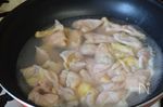 A 湯 500ml、鶏がら顆粒 小2、酒 大1 に鶏皮をを入れ、軽くゆでて取り出す |