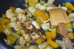 鶏むね肉は皮を外し、一口大に切る。B 白ワイン 大2、塩 小1/2、こしょう 少々 を揉みこんでおく。玉ねぎはスライスし、かぼちゃは小さくカットする。 |