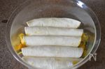 トルティーヤに粗熱が取れた③を巻いて、綴じ目を下にして耐熱容器に並べる。 余ったフィリングはトルティーヤの隙間に入れる |