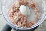 玉ねぎをフードプロセッサに軽くかける。ひと口大に切った鶏肉、クレイジーソルト、片栗粉も加え肉が細かくなりすぎないよう粗目でとめる。皮が気になる場合は取り出して切っても。 | |