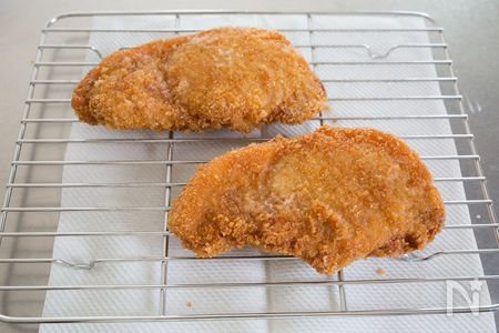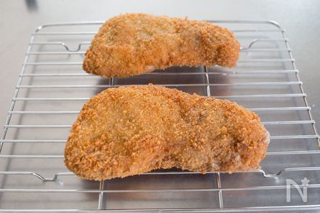 4. 豚肉の全体がきつね色になるまで揚げます。揚げ終わったら、豚肉を立たせながらしっかりと油を切り、網の上にのせましょう。ここで油切りをしっかりすることで、サクッとした衣になります。粗熱が取れたら食べやすい大きさに切って完成!