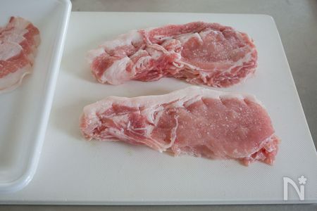 1. 豚ロース肉を同じ向きに10枚ずつ重ねます。肉の赤身と脂身の中間部分5~6箇所に包丁を入れて筋切りをします。両面に軽く塩をふり、片面にこしょうをふっておきましょう。