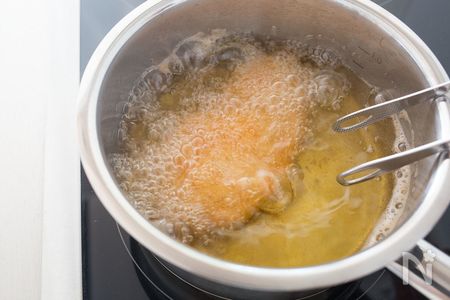 170度の油で両面がキツネ色になるまで揚げます。揚げ油に豚肉を入れたら20秒以上は触らずにそのまま待ちましょう。触りすぎると衣が剥がれる原因になります。また、揚げ終わりはしっかりと油を切ることを忘れずに!