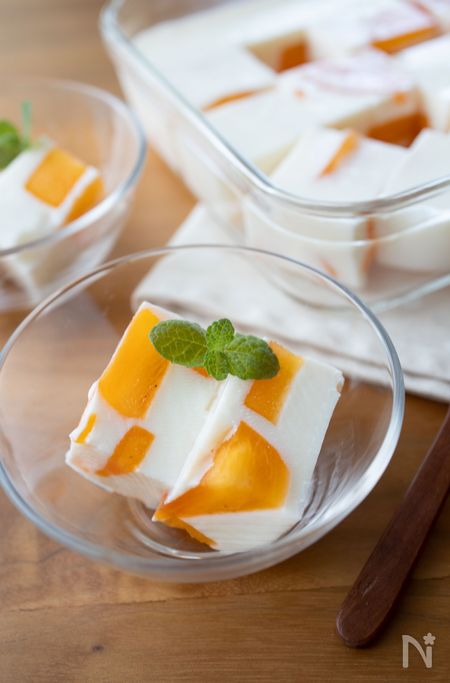 牛乳たっぷりのミルク寒天に柿を合わせたちょっと意外な組み合わせですが、コンデンスミルクを加えてコクのあるミルキーな寒天とさっぱりした甘さのフレッシュな柿は実は相性抜群! お好みで黒蜜をかけたりあんこを添えたりして、和風仕立てにしても美味しいですよ。