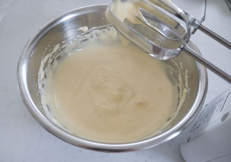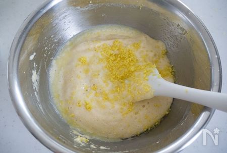 5.この温めたバターと牛乳、太白ごま油、レモン果汁、すりおろしたレモンの皮を3の生地に加えて、同じようにゴムベラですくい上げるように優しく混ぜます。