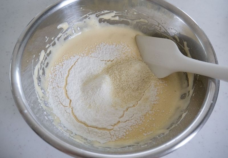 3.ここにふるった薄力粉とベーキングパウダー、アーモンドパウダーを加えます。ゴムベラで底からすくい上げるように、粉っぽさがなくなる程度まで優しく混ぜます。