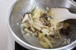 ②の鍋にバター(無塩)を溶かし、玉ねぎとしめじをしんなりするまで中火で炒める。薄力粉を加え、全体に馴染むように炒めたら火を止める。 | |