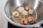 鍋に少量のサラダ油を中火で熱し、帆立貝柱とえびの両面をさっと焼く。取り出して帆立は4等分、えびは3等分に切る。 | |