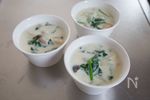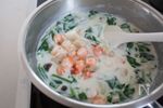 B 牛乳 300ml、水 100ml、鶏がらスープの素(顆粒) 小さじ1と1/2 を加えてとろみがつくまで加熱したら、ほうれん草と帆立貝柱、えびを加え、C粉チーズ 大さじ1/2、塩 小さじ1/3、こしょう 少々 で味をととのえる。一煮立ちしたら火を止める。 |