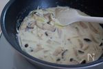 2のフライパンにバターを入れ、中火で玉ねぎとしめじ、エリンギを炒める。しんなりとしてきたら、強力粉を加えて軽く炒め合わせる。 | |