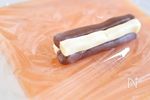 渦巻型はそれぞれの生地をラップで挟み、10センチ四方くらいに伸ばして重ね合わせて丸め、NEWクレラップで包み、冷蔵庫で30分ほど落ち着かせる。 | |
