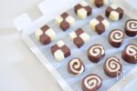 好きな形に成形する。市松模様型は棒状に伸ばしたものを角が出るように成形し、プレーン生地とココア生地を市松に組み合わせてしっかり密着させてからNEWクレラップで包み、冷蔵庫で30分ほど落ち着かせる。 | |
