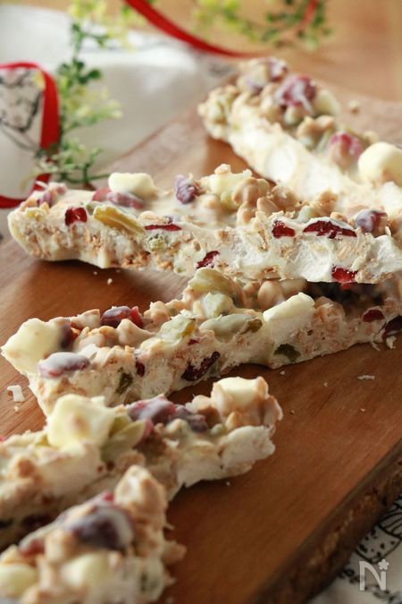 もっと簡単に作りたい! という方におススメ。ホワイトチョコを溶かして、ドライクランベリーとレーズン、マシュマロ、グラノーラを混ぜて固めるだけ。お好みのドライフルーツでOKですが、クランベリーの酸っぱさはホワイトチョコにぴったりなのでぜひ入れてみて!