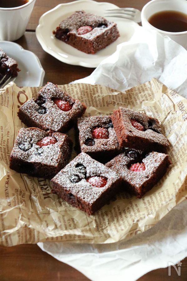 いちごをのせて焼いたブラウニーは、大きなスクエア型で作ってカットすれば、プレゼントでたくさん配りやすいですよね。