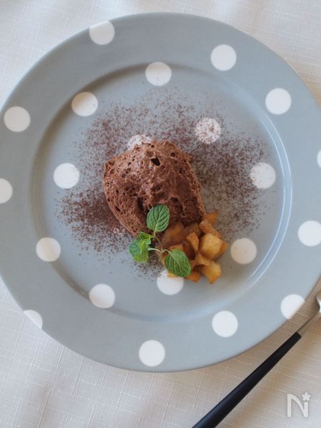 こちらはプレートに盛り付けてレストランのデザートのように仕上げました。りんごのほろ苦い甘みと食感が、濃厚だけどふわっと軽いムースにマッチして、食後でもどんどん食べられます。