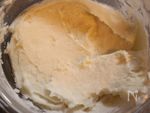再びラップをふんわりかけ、600Wのレンジで3分加熱する。 大きめに切ったクッキングシートの上に、水で濡らしたヘラで生地を取り出す。 角を折りたたみながらクッキングシートの上からつやが出るまで捏ねる。 (熱いのでやけどしないよう注意すること) その後、粗熱を取る。 |